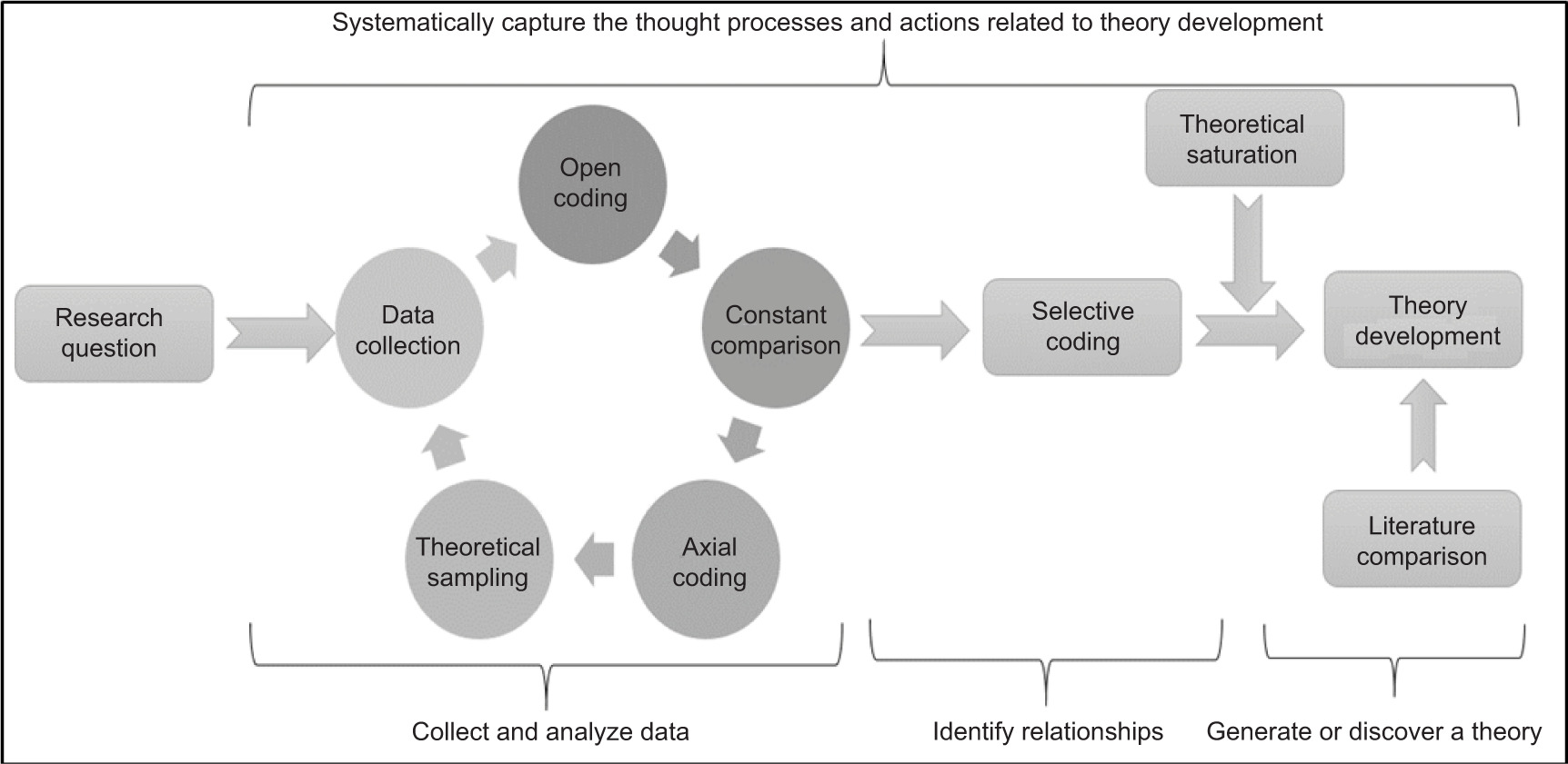 The constant comparison step is a technique created by Glaser and Strauss [38] where the researchers classified and integrated pieces of raw data based on their characteristics and constructed the classifications from incidents they observed in an orderly manner to form new theoretical perspectives [47]. This constant comparison of the incidents began to generate theoretical properties that would form the basis for generating categories. In the process of comparisons, the researchers thought of the many possible range and types or continua of the categories that could be created, including the dimensions, the conditions under which the incidents were observed, and the consequences of these incidents, in relation to other incidents. The constant comparison of these incidents started generating theoretical properties of the mentioned categories.