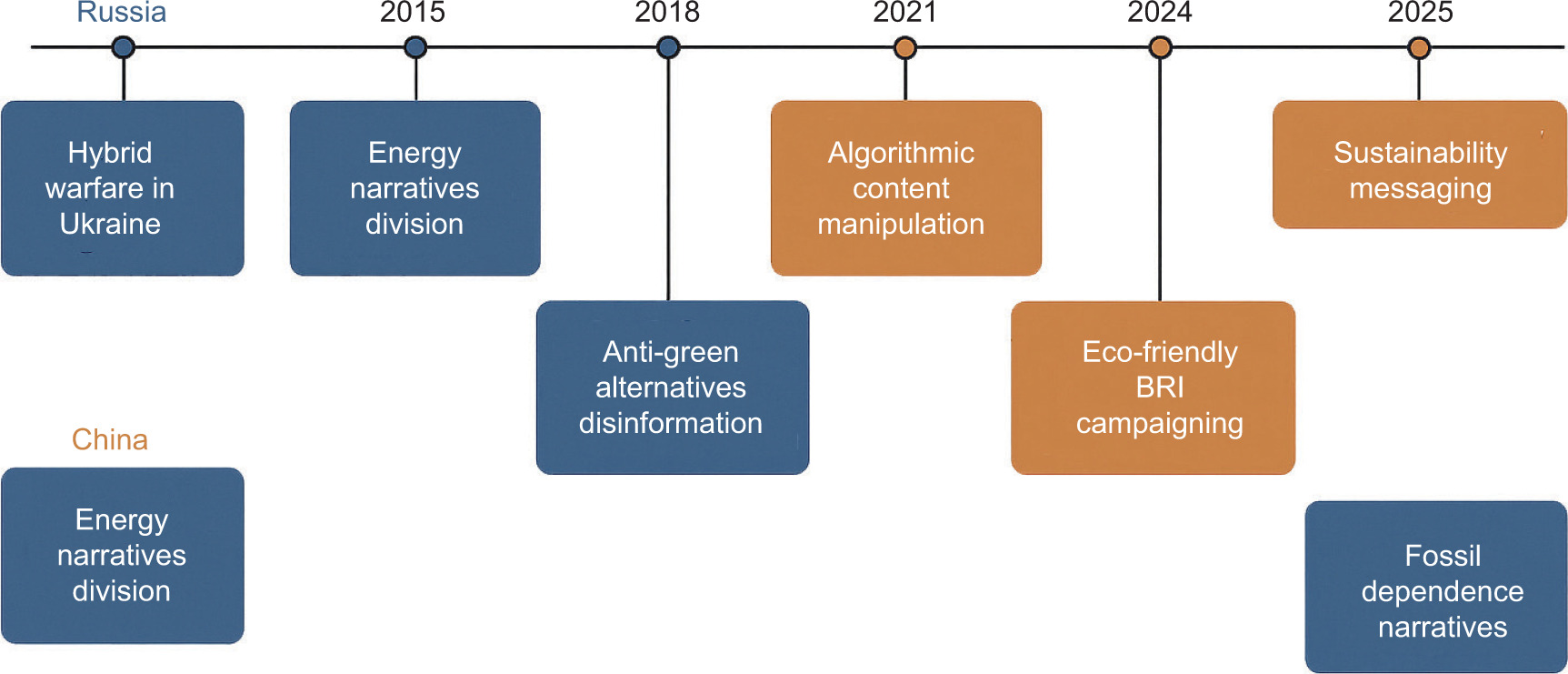 Figure 1 illustrates key disinformation and influence operations targeting the EU’s energy transition, distinguishing between Russia’s disruptive reflexive-control tactics and China’s long-term narrative co-optation strategies.