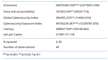 It was found that Voice and accountability (β=141343.544, p=0.008), Global Cybersecurity Index (β=384493.225, p=0.002), Cybersecurity Exposure Index (β=49756239.387, p=0.000), and level of literacy (β=288067.744, p=0.072) significantly predicted password strength. It was also found that the GDP per capita (β=27.981, p=0.696) did not significantly predict password strength.